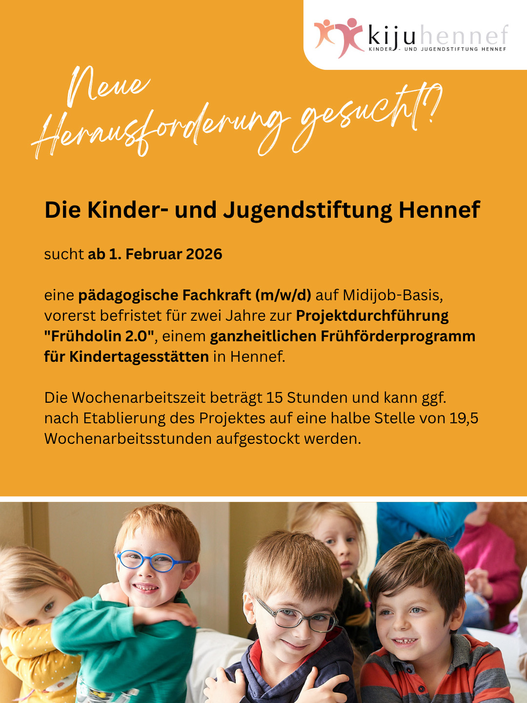 Die Kinder- und Jugendstiftung Hennef sucht ab 1. Februar 2026 eine pädagogische Fachkraft (m/w/d) auf Midijob-Basis, vorerst befristet für zwei Jahre zur Projektdurchführung von Frühdolin 2.0, ei...