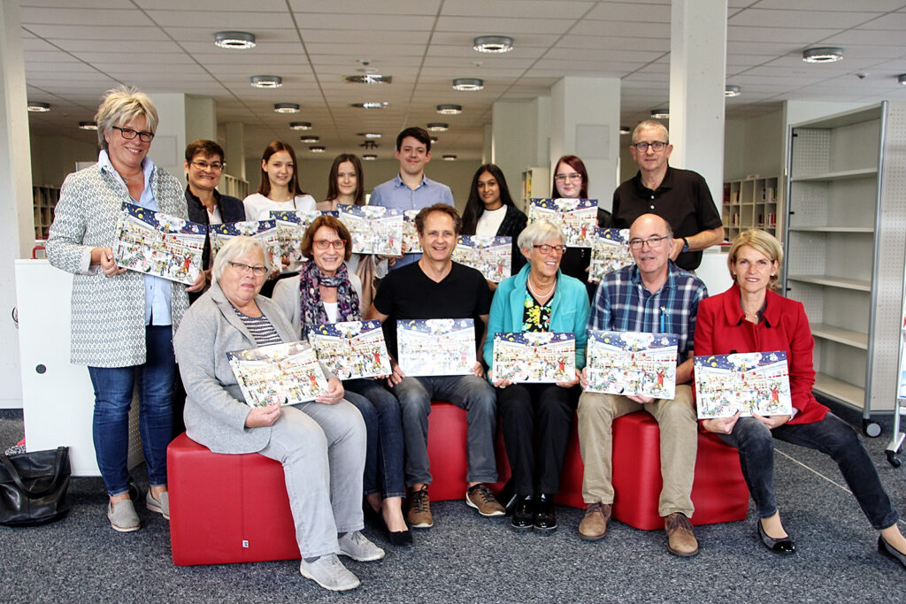 Franz Alfter, Elke Grünig, Helmut Rüßmann und Uschi Yogeshwar brachten gemeinsam mit der Künstlerin Barbara Behr die ersten Exemplare vorbei. Schulleiterin Iris Zillinger und ihr Stellvertreter Norbert Spanier freuten sich über das süße Paket und versicherten gemeinsam mit den Schülern, die im Selbstlernzentrum bei der feierlichen Übergabe dabei waren, dass sie so viele Kalender wie möglich verkaufen wollen.
