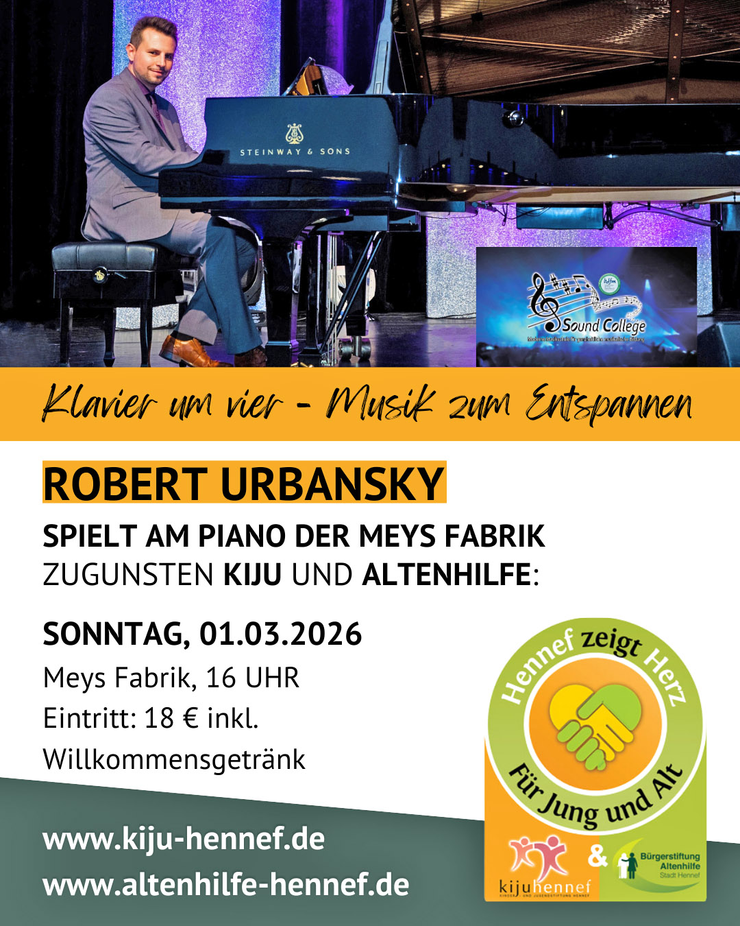 Robert Urbansky, der neben seiner Musikschule auch die Chöre Hennefer Diamanten und Kurparktulpen leitet, wird am 1. März ein Konzert am Flügel der Meys Fabrik zugunsten der Kinder- und Jugendstiftung und der Bürgerstiftung Altenhilfe geben. Der Eintritt kostet inklusive Willkommensgetränk 18 Euro, Beginn ist um 16 Uhr. Die Besucher dürfen sich auf einen Nachmittag mit entspannter Klaviermusik freuen.