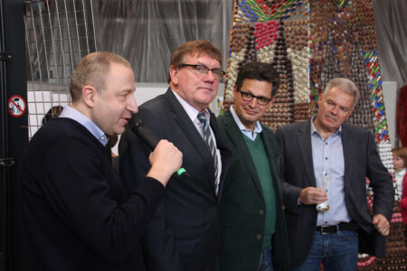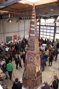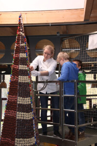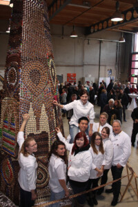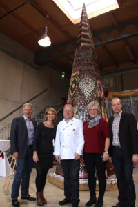 Denn die angehenden Konditorinnen und Konditoren im zweiten Ausbildungsjahr hatten mehr als 20.000 Köstlichkeiten zur wohl größten Pralinenpyramide der Welt aufgetürmt. Bis in das Oberlicht hinein ragte die sechs Meter hohe Konstruktion. An ihrem freien Samstag hatten die Auszubildenden unter Anleitung von Ideengeber Heiner Krautscheid bis 18 Uhr einen Trüffel nach dem anderen aufgeklebt, bis die Kalorienrakete endlich fertig gestellt war.